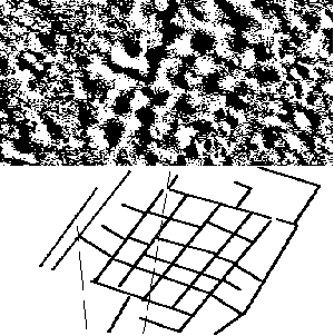 Проблема Аномальных Пещер Луны.А.В.АрхиповРадиоастрономический институт НАНУ,ХарьковХотя Луна является наиболее изученным небесным телом, морфология её поверхности на шкалах менее 1 км исследована ещё недостаточно. В этом смысле интересны результаты обзора изображений Луны, полученных камерой высокого разрешения (HIRES) космической станции "Клементина" [1]. Этот обзор выполнялся как часть авторского проекта SAAM по археологической разведке Луны, охватывает ~80000 снимков полярных областей спутника и в настоящее время уже завершён. Методика и некоторые результаты обзора кратко описаны в [2,3]. Среди разнообразных находок можно выделить неизвестный ранее тип провалов, которые уместно назвать вафельными. Это отрицательная форма рельефа в виде небольших депрессий, обычно прямоугольных очертаний, примыкающих друг к другу и выстроенных рядами и шеренгами в виде своеобразной прямоугольной матрицы. Характерные размеры ячеек вафельных депрессий - десятки метров. Их глубина ~10 м, а поперечник всей матрицы - порядка километра. Характерный пример таких образований показан на рисунке в виде т.н. SAAM-изображения (клиппированная разность исходного и сглаженного изображений [2]) мозаики снимков LHD5470Q.287 и LHD5472Q.287 [1]. Ниже помещена схема линеаментов. Тонкие линии отмечают линеаменты геологического фона.